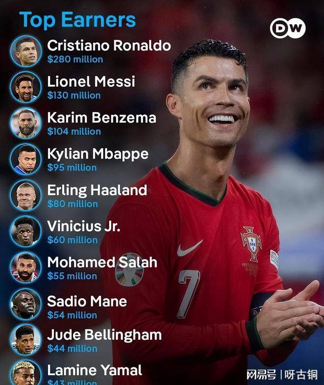 1、C罗,总收入2.8亿美元(年薪2.3亿美元,场外代言5000万美元,包括耐克、Binance和CR7品牌)