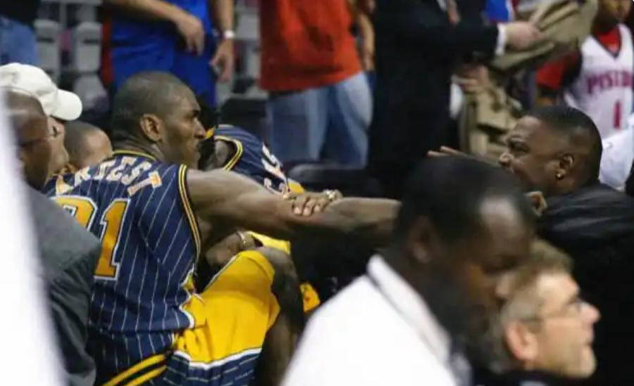 众所周知,在2004年11月19日,活塞队对阵步行者的比赛中,阿泰斯特采取了激烈的犯规动作阻止本·华莱士的上篮,激怒了华莱士,导致双方发生冲突。在冲突中,阿泰斯特躺在解说席上挑衅,引发了活塞球迷投掷啤酒的情况。阿泰斯特随后冲入观众席袭击一名球迷,引发了球员和球迷之间的对抗。底特律作为汽车之城,其坚实的工人们又怎么会惧怕NBA球员呢?