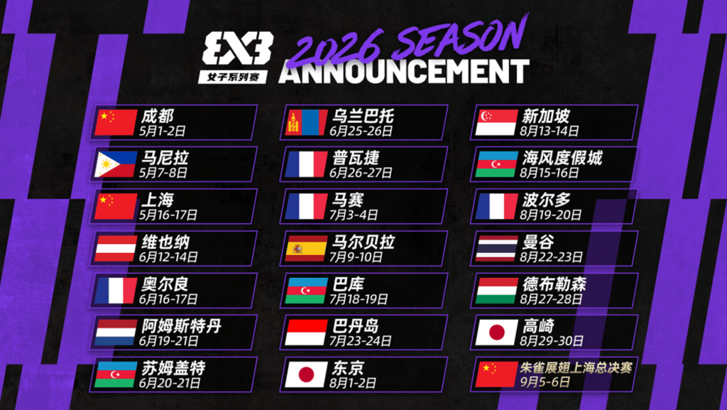在亚洲揭开序幕后,2026赛季国际篮联三人篮球女子系列赛将在6月进入赛程密集阶段,跨越亚洲和欧洲的多个国家。