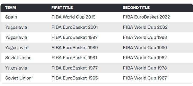 回顾历史,苏联男篮在1967年首次实现这一壮举,随后又在1982年再次复制辉煌。前南斯拉夫男篮则展现了惊人的统治力,在1977年至2002年期间四次完成双冠伟业。而西班牙队作为最近加入这一精英俱乐部的成员,分别在2019年和2022年两度加冕,展现了欧洲篮球强国的深厚底蕴。