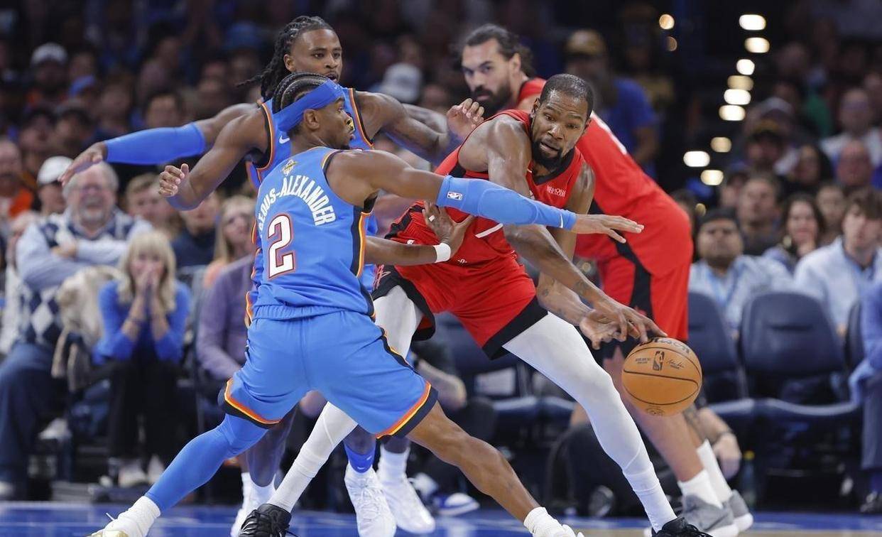 常规时间最后9.5秒,火箭领先2分。 杜兰特获得两次罚球机会。 第一罚命中,第二罚弹框而出。 亚历山大抓住机会,中距离跳投将比赛拖入加时。